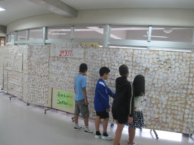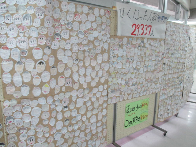 「平和を考える旬間」の取組のひとつで6年生が制作したそうです。一人で数十名の笑顔をかいたそうです。表題を見ますと「戦争で亡くなった人の数」と書いていました。掲示板からはいろんなメッセージが聞こえてくるようでした。