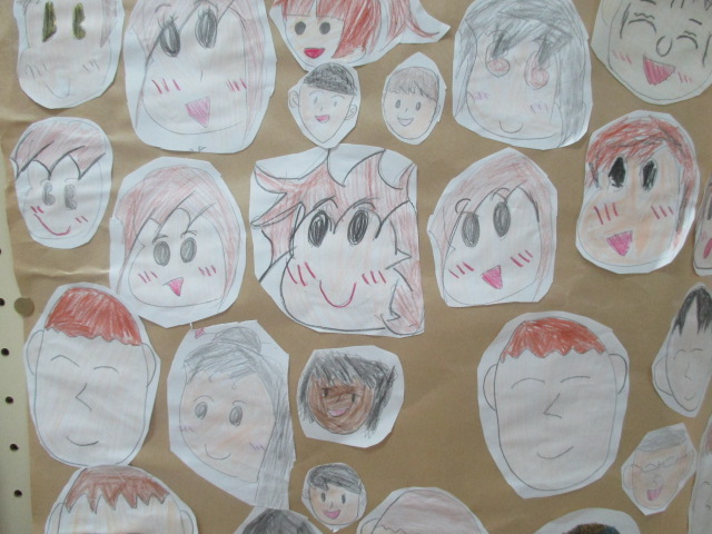 エントランスに大型掲示板が現れて、子ども達の目を引いています.よく見てみると子どもの顔の絵が貼られています。みんな笑顔です、数えるといくつくらいでしょうか、とにかくたくさんの顔です。