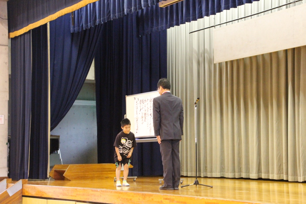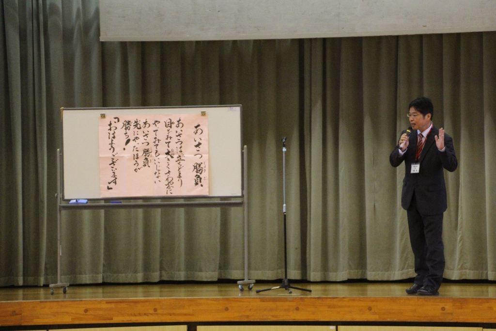 今朝のお話朝会では校長先生から「あいさつ勝負」のお話がありました。