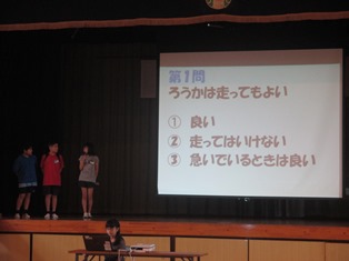 ほとんどの子が正解に手を上げていました。しかし、数名はちがう番号に手を上げていました。まちがった知識は,危険な行動へと繋がります。すぐその場で正しい答えを教えていました。
