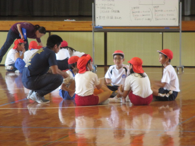 子ども達はめあてを持ち、練習したり,試合をしたりしていました。作戦の時間はチームが輪になりボードをもとに話し合いが活発に行われました。