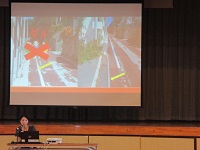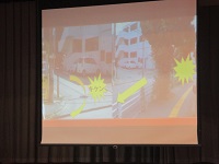 真地小学校周辺での危険箇所や危ない場面について、写真等を使いわかりやすく説明がなされました。子供たちは最後まで、教師の話を真剣に聞いていました。