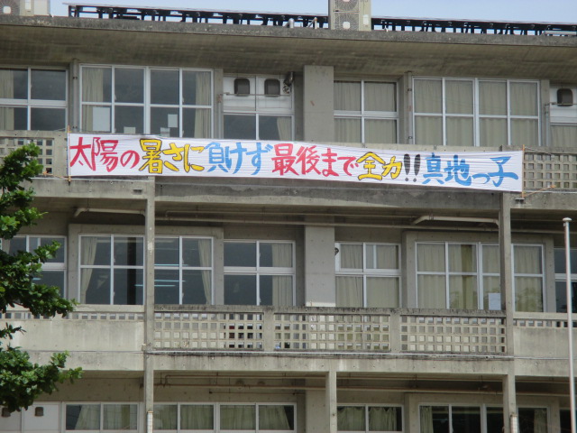 「太陽の暑さに負けず、最後まで全力 真地っ子」のテーマが堂々と張り出されました。残暑きびしいおりですがそれに向かいながら強くたくましくなろうという真地っ子の意思が表れたテーマです。暑いからこそ、水分補給、睡眠休養,早寝早起き朝ご飯にしっかりと取り組み、自分で体調管理する力をつけましょう。