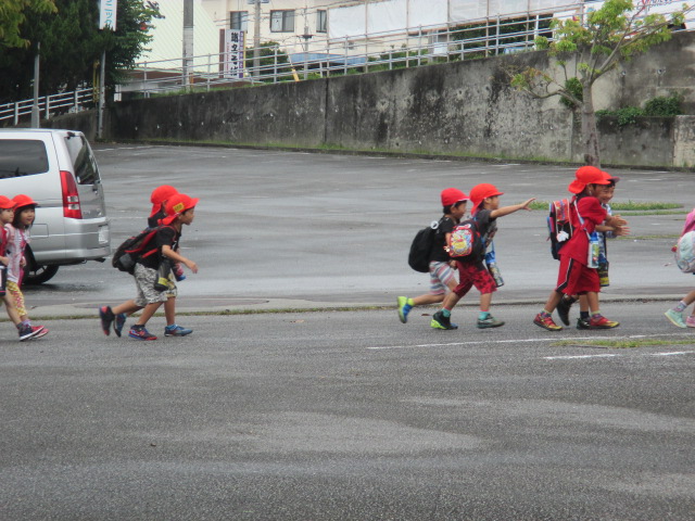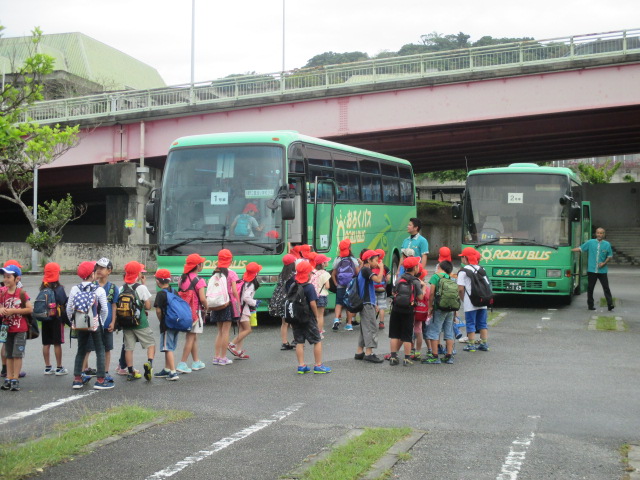 朝方の雨も上がり、バスへ乗り込む子ども達