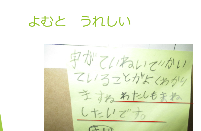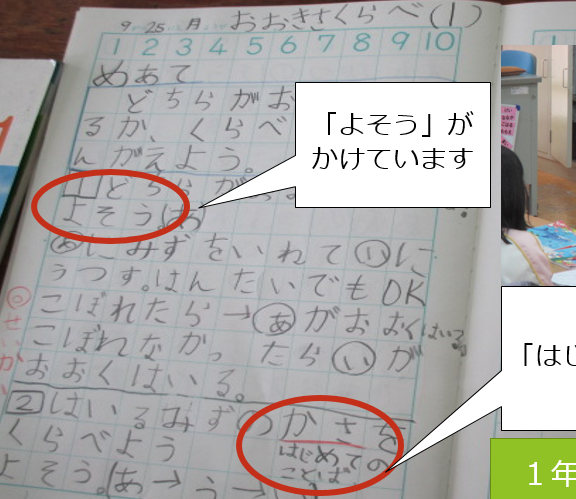 一学期は、勉強がんばりました、三つの力がつきました、ノートの使い方も上達しました、やさしい子がいっぱい生まれました、みんなでいじめをなくしました、運動会かっこよく成功しました。