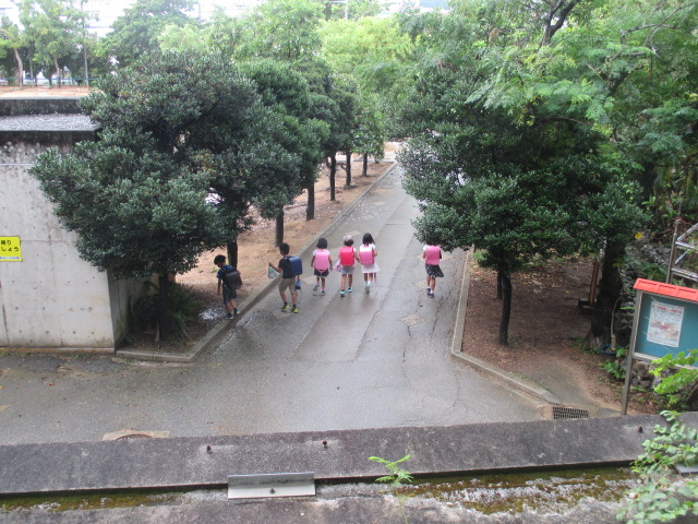 さきほどまで降っていた雨もちょうどいまやんだところです。会話が弾みます,下校時。みんな楽しそうです 真地っ子。