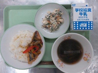 牛乳 粟ご飯 イカスミ汁 グルクンのアーサソースかけ 白和え