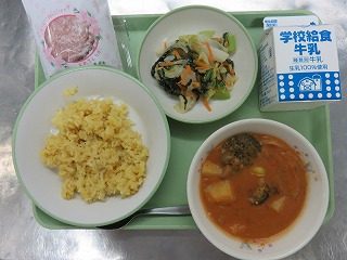 ライス(カレー風味ごはん)・ビーフシチュー・小松菜のアーモンド和え・お祝いモンブラン・牛乳です。