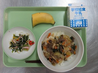 プルコギ丼(あわごはん)・ほうれんそうナムル・バナナ・牛乳 です。