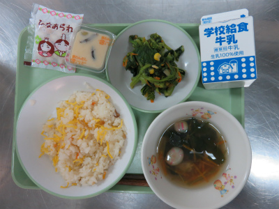 牛乳・ちらしずし・すまし汁・菜の花の梅和え・茶碗蒸し・ひなあられ