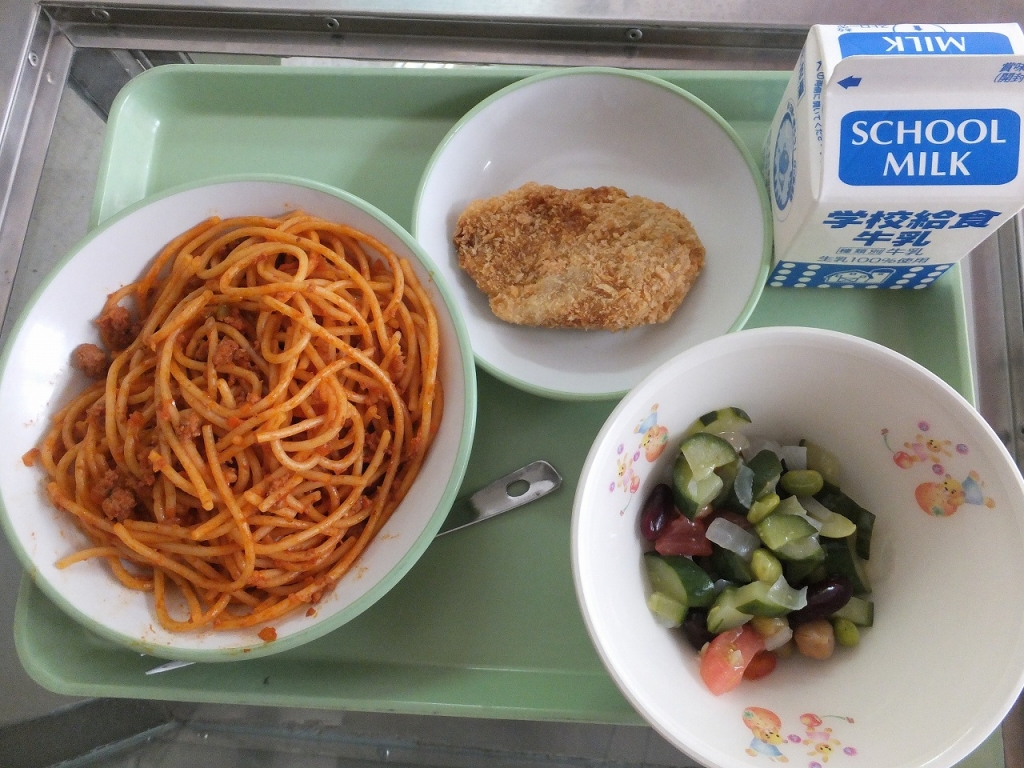 ・牛乳 ・スパゲティ(ミートソース) ・まぐろフライ ・まめまめサラダ