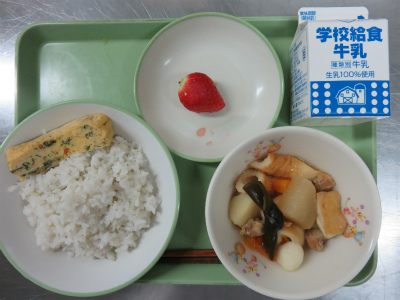 牛乳・麦ごはん・千草やき・おでん・いちご