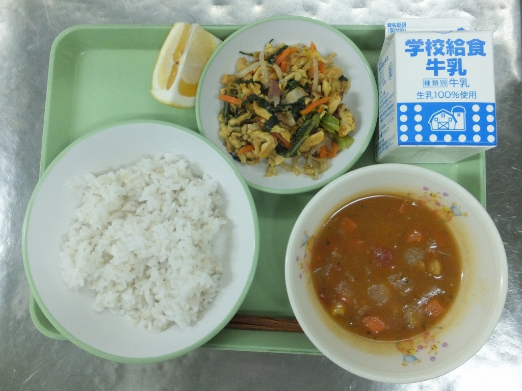 ・牛乳 ・むぎごはん ・カレースープ ・フーチャンプルー ・ニューサマー