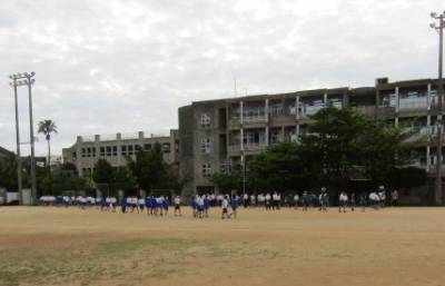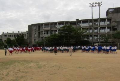 新しい体育館を建設中のため、初めての校長講話を運動場で行いました。