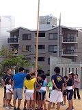 ラジオ体操の後は旗頭の練習をしています
