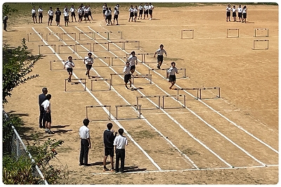 東京世界陸上 2025 の 110mH で決勝に進出した**村竹ラシッド選手**に負けるとも劣らずのハードリング。体育の授業です。
