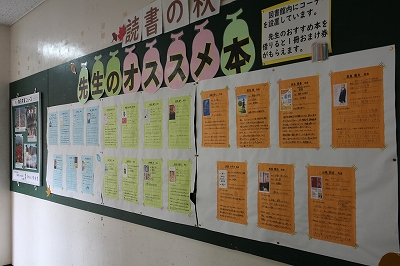 読書の秋、読書旬間(11/4~11/17)で、図書委員会が、①先生たちのおすすめ本紹介、②図書委員のおすすめ本広報、③ミッション!!失われた本を探せ! などの取組を行いました。(先生たちのおすすめ本紹介の掲示)