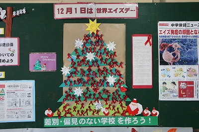 保健委員会の取組、レッドリボンが、全生徒・職員に配られました。昨日1日間は、胸に着け、今日から、保健室前のクリスマスツリーにデコレーションとしてレッドリボンを飾り付けていきます。