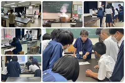 理科の**先生の授業は、単元名「化学変化と原子・分子」7時間計画中の7時間目「酸素が関わる化学変化」でした。これまでの学習をもとに「マグネシウムは、ドライアイスの中で燃えるか。」について根拠をもって予想する。演示実験により「燃える!」ことがわかったら、実験で起こったことを化学反応式やモデルにまとめる(個別)。そこから、各自席を立って意見を交流させる。こんな風に、どんどん席を立って、こどもたち同士が交流したり、協働的に学んだりしてほしい。まとめでは、2名が化学反応式を黒板に書いたが、ロイロノートがあれば、ここで一発、全員の化学反応式を全体共有でき、協働的な学びがひとまず成り立つ。惜しい!!
