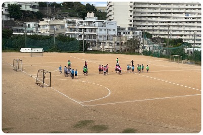 楽しそうな声が聞こえ、校長室のベランダからグランドをのぞんでみると、1年生がサッカーの学習中で、チームに分かれてドリブルでリレーをしていました。ワイワイとても盛り上がっています。青チームが僅差で勝利でした!