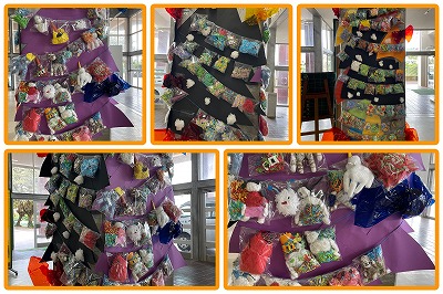 肌寒くなりました。学校も今日から冬服調整期間です。生徒玄関には季節感たっぷりのクリスマスツリーがお目見え。生徒たちの美術の作品です。