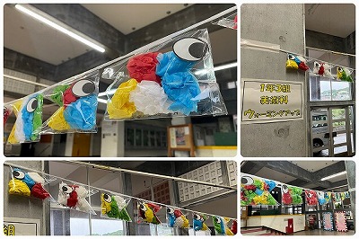 「こどもの日」。21世紀ロビーにたくさんのカワイイ鯉が泳いでいます。1年生が美術の時間にウォームアップで作成しました。
