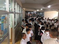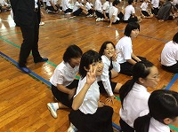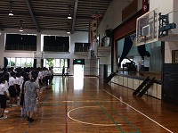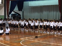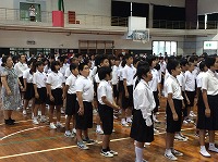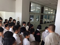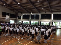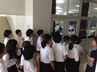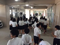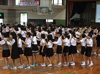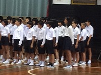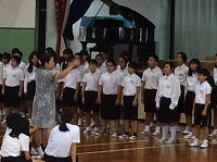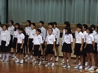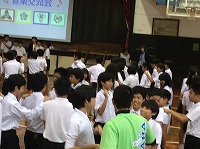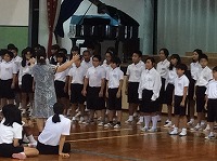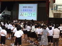 那覇中グループ音楽交流会 ~ 素敵な歌声に会場喝采 ~ 小中一貫教育の中、本日、那覇中学校で音楽交流会が行われました。まず、はじめに那覇中生徒会より、中学校のガイダンスの説明がありました。その後、中学校教諭による校内の案内がありました。理科室(4教室)・技術室・美術室などを案内してもらいました。児童は、興味深く話を聞きながら説明を聞いていました。その後、体育館に戻り音楽発表会を行いました。司会進行を本校の6年生が務めました。会の中で、3小(泊・若狭・那覇)の6年生でゲーム「じゃんけん列車」をしました。楽しく、他校の児童と交流していました。さて、合唱「明日の空へ」の方は・・・、圧巻の歌声で、終わった後は、拍手喝采。見事な歌声でした。そして、会の終わりには、「翼をください」を全員で合唱しました。小中の繋がりを強く感じるとともに、中学校進学に向けた意欲付けになる良い1日となりました。 校内視察