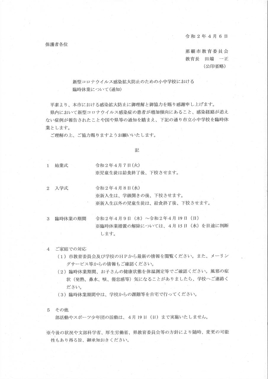 令和2年4月6日 那覇市教育委員会より 通知