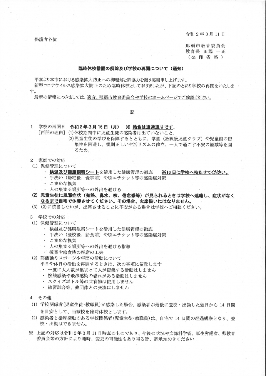 令和2年3月16日(月)より学校を再開となります。