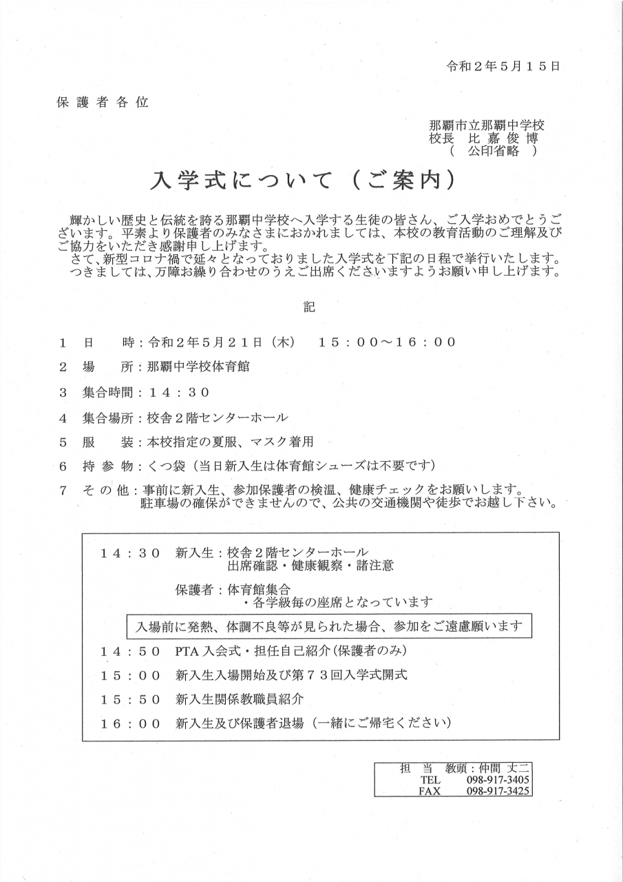 令和2年度 第73回入学式 を下記の通り実施致します。