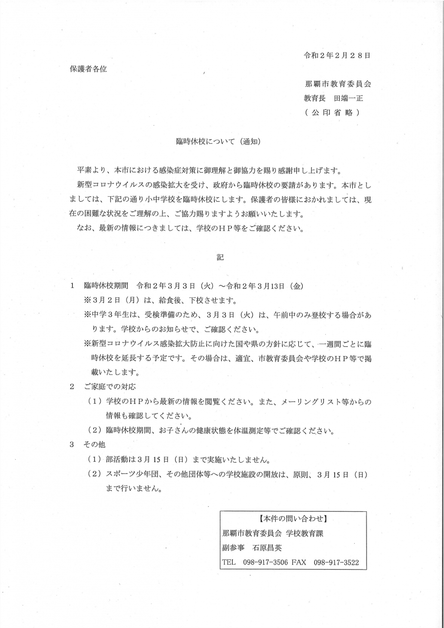 臨時休校について(新型コロナウイルス)