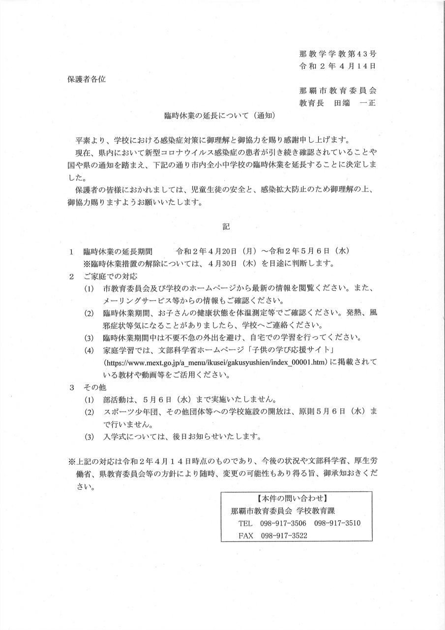 那覇市教育委員会より、「臨時休業の延期について(通知)」の連絡がありましたのでお知らせいたします。