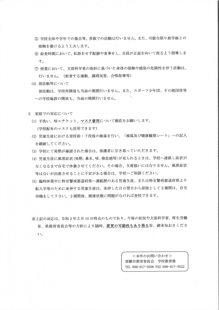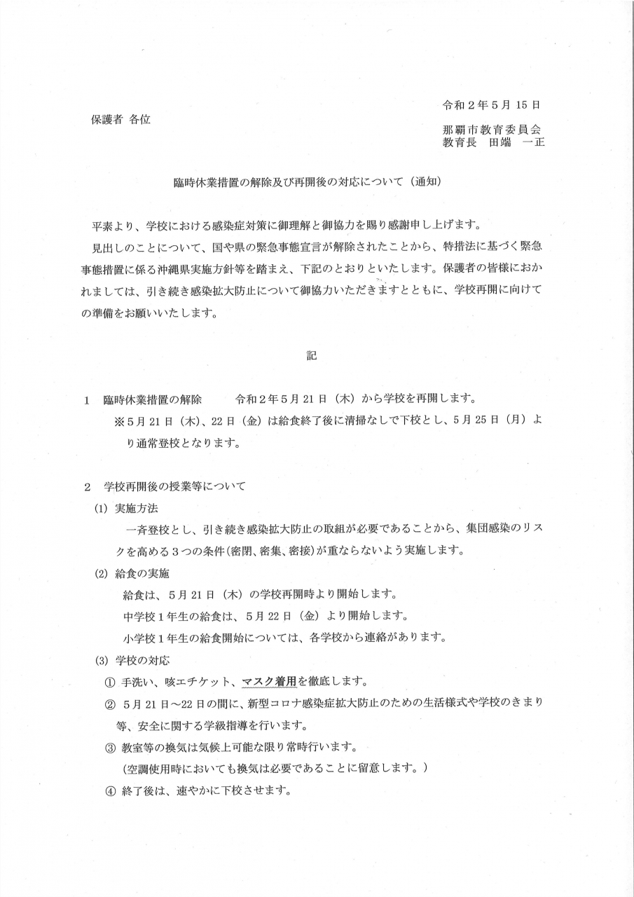 5月15日付 那覇市教育委員会より通知がありましたので、お知らせ致します。