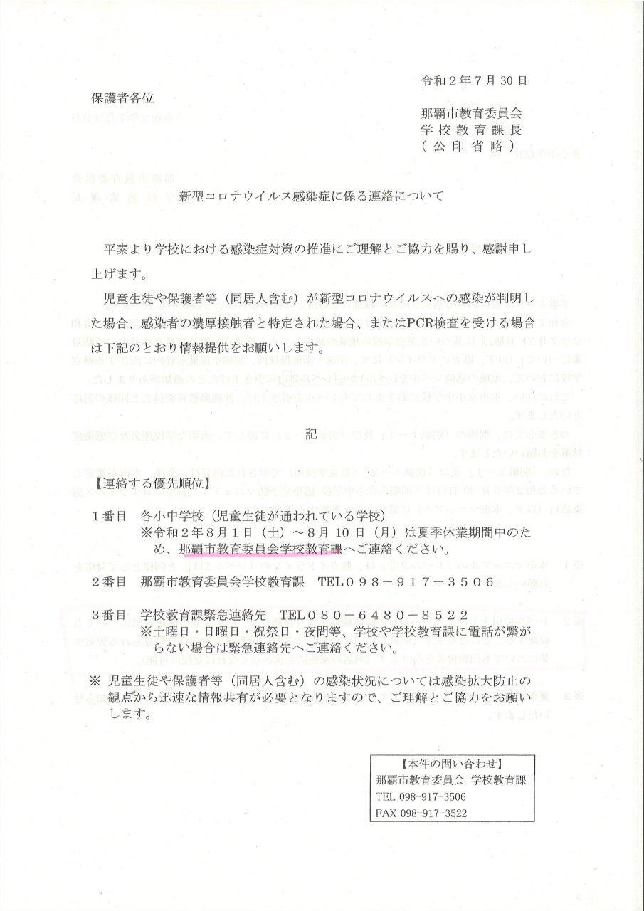 令和2年7月30日 那覇市教育委員会からの連絡