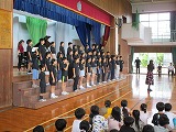 9月11日(水)に、音楽朝会を開きました。今月の歌「世界がひとつになるまで」を、始めに合唱部が歌い、次に全体で斉唱しました。歌詞にある「世界がひとつになる」ように心を込めて歌いました。