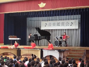 12月10日(水)、マリンバを使った音楽団体、「マリンビスタ」の方々を学校に招き、音楽鑑賞会を行いました。生演奏の迫力に、子ども達は大喜びでした。また、ロックトラップ(ボディーパーカッション)やマリンバ体験、妖怪ウォッチのダンスなど、様々な形で音楽を楽しむことができました。