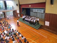 11月9日(水)に小中一貫教育の一環として、金城中学校1年2組(金賞受賞クラス)の皆さんを迎えて音楽朝会を行いました。中学生の歌うBelieveに全校児童は感動し聴き入っていました。美しい歌声とその姿に憧れを抱いたことでしょう。