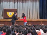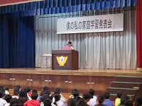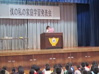 2月28日の全校朝会では、「僕の私の家庭学習発表会」が行われました。