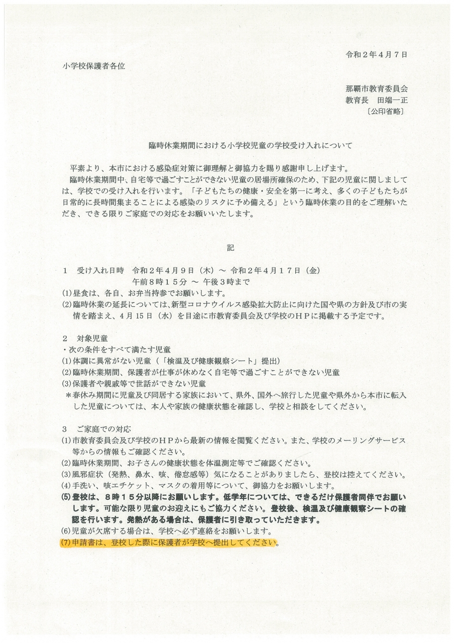 臨時休業期間中、自宅で過ごすことがことができない児童の居場所確保のため、下記のお知らせにある児童に関しては、学校での受け入れを行います。お知らせを確認の上対応をお願いします。なお、受け入れの際には、「申請署」「検温及び健康観察シート」の提出をお願いします。