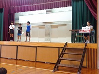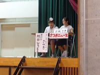 平成27年9月2日(水)図書朝会がありました。図書委員会による本の紹介や、読書月間に行われる内容のお知らせでした。最後に方言クイズもあり、盛り上がりました。読書月間中は読書クイズも行われる予定です。たくさんの本を読んで、全問正解目指してがんばりましょう。