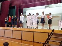 平成28年6月1日(水)児童朝会がありました。今日はピカリン朝会と題して、保健委員会が中心となって行いました。まずは、6年間むし歯の無かった児童10名を表彰しました。これまで1本もむし歯が無かったことは、とても素晴らしいことですね。これからも頑張ってください。表彰の後は、保健委員会のみなさんが歯や歯みがきの大切さを「劇」で伝えてくれました。衣装や小道具、大道具、効果音などにもこだわり、とても分かりやすく楽しく伝えてくれました。保健委員会のみなさん、ありがとうございました。