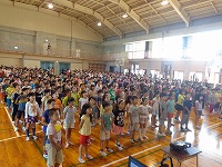 平成27年9月2日(水)図書朝会がありました。図書委員会による本の紹介や、読書月間に行われる内容のお知らせでした。最後に方言クイズもあり、盛り上がりました。読書月間中は読書クイズも行われる予定です。たくさんの本を読んで、全問正解目指してがんばりましょう。