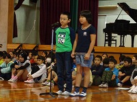 平成29年1月25日(水)今年度最後の音楽朝会がありました。ファイナルを飾るのは4年生です。全校児童で校歌を歌った後、「琉球音階」について学習したことを、まずは発表しました。ドレミファソラシドの「レ」「ラ」を抜かしたものが「琉球音階」と呼ばれていて、代表児童の演奏を聴くと、とてもなじみ深い音が流れ、納得することができました。