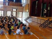 平成28年8月26日(金)お話朝会がありました。長い夏休みが終わって、今日から一学期後半がスタートし、学校には元気な子ども達の声が響いていました。校長先生からは、リオオリンピックで活躍した日本人選手のインタビューを用いて、「目標を持つことの大切さ」「最後まであきらめないこと」等のお話しがありました。