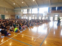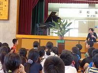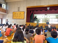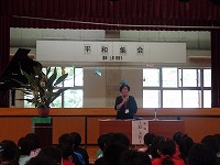 平成28年6月9日(木) 2校時に体育館で平和集会がありました。上原美智子さんを講師にお招きし、戦争体験を語っていただきました。当時小学校3年生だった上原さんは、戦時中は食べ物が無くて常にお腹が空いていた事、壕の中は暗くて暑くて、とにかく辛かった事等、戦争の恐ろしさ、命の大切さについて、たくさんの事を語っていただきました。最後に6年生が「お礼の言葉」と平和への願いを込めて「月桃」を合唱しました。