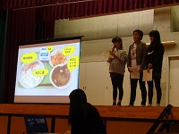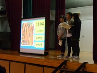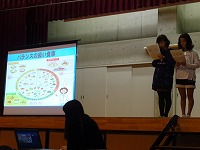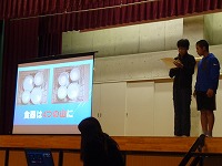 平成29年1月18日(水)児童朝会がありました。今日は給食委員会の発表でした。給食の歴史や給食の片付け方、バランスの良い食事の取り方や沖縄長寿県を取り戻そうといった話などを、スライドを活用して説明してくれました。最後には、クイズも出題され、楽しく学習することができました。来週から給食習慣が始まります。 今日のお話を生かして頑張りましょう。給食委員会の皆さん、ありがとうございました。