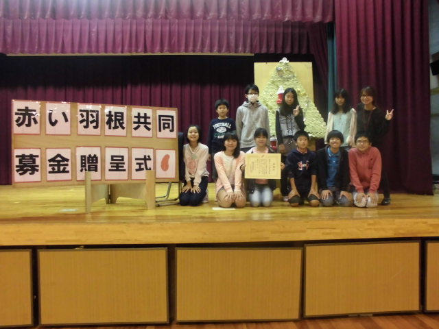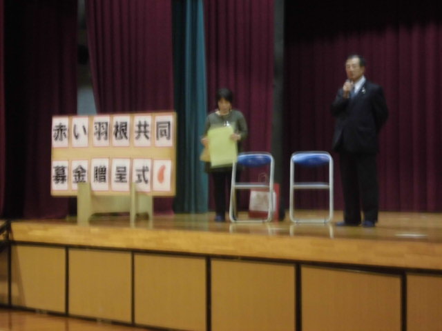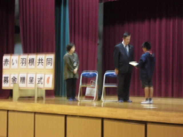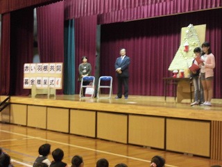 12月16日(水)児童朝会があり、赤い羽根共同募金の贈呈式でした。