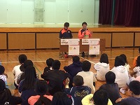 平成27年9月2日(水)図書朝会がありました。図書委員会による本の紹介や、読書月間に行われる内容のお知らせでした。最後に方言クイズもあり、盛り上がりました。読書月間中は読書クイズも行われる予定です。たくさんの本を読んで、全問正解目指してがんばりましょう。