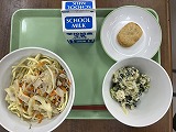 本日の給食は「ミートソーススパゲティ」「ほうれんそうオムレツ」「ポテトとブロッコリーのチキンサラダ」「牛乳」です。