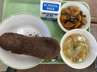 「黒糖パン」「ハロウィンバーグ」「カボチャのスープ」「グリーンサラダ」「牛乳」です。